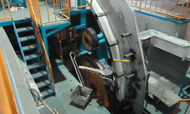 新東電鋁錠鑄造機(jī)由上下澆煲,重力調(diào)流裝置,結(jié)晶輪及傳動(dòng)裝置,壓緊輪裝置,鋼帶涂油裝置,引···